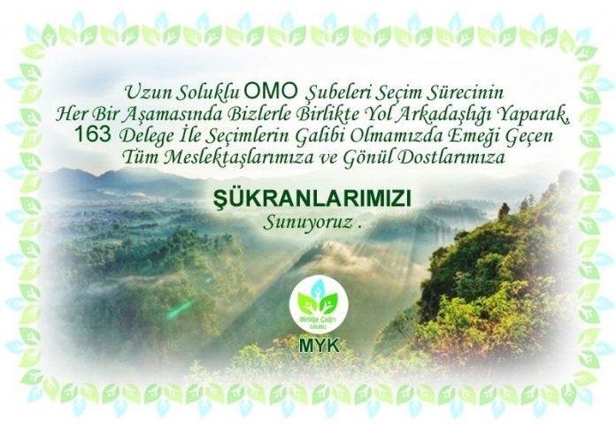 Uzun soluklu OMO şubeleri seçim surecinin her bir aşamasında bizlerle birlikte yol arkadaşlığı yaparak, 163 Delege ile Seçimlerin galibi olmamızda emeği geçen tüm meslektaşlarımıza ve gönül dostlarımıza şükranlarımızı sunuyoruz.